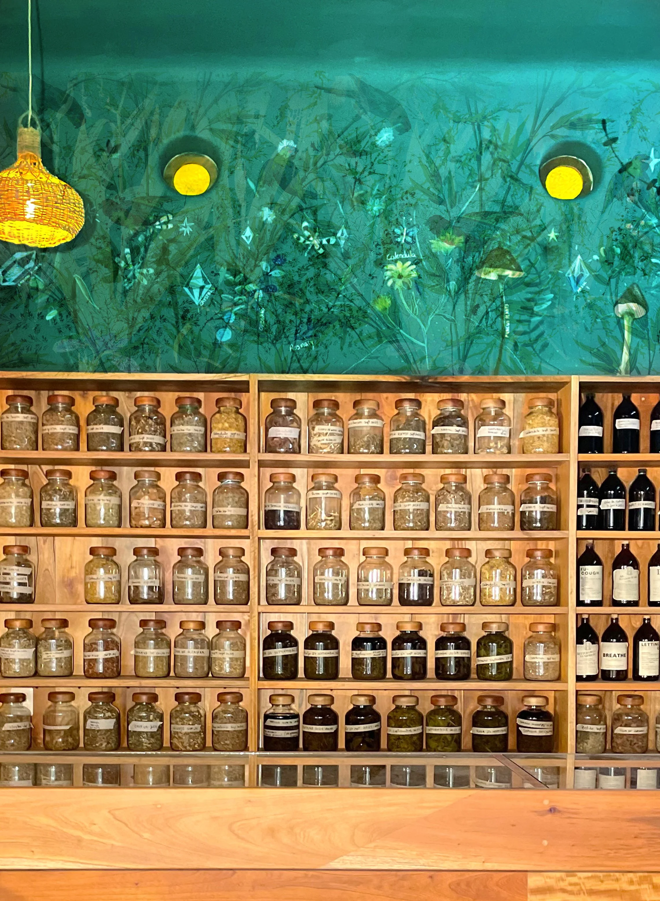 Creating murals within interior spaces enhances the atmosphere and transforms interiors into works of art. This commissioned project for a herbal store brings together themes of herbs, plants, and flowers, translating a passion for nature into an immersive environment where the walls become part of the experience.