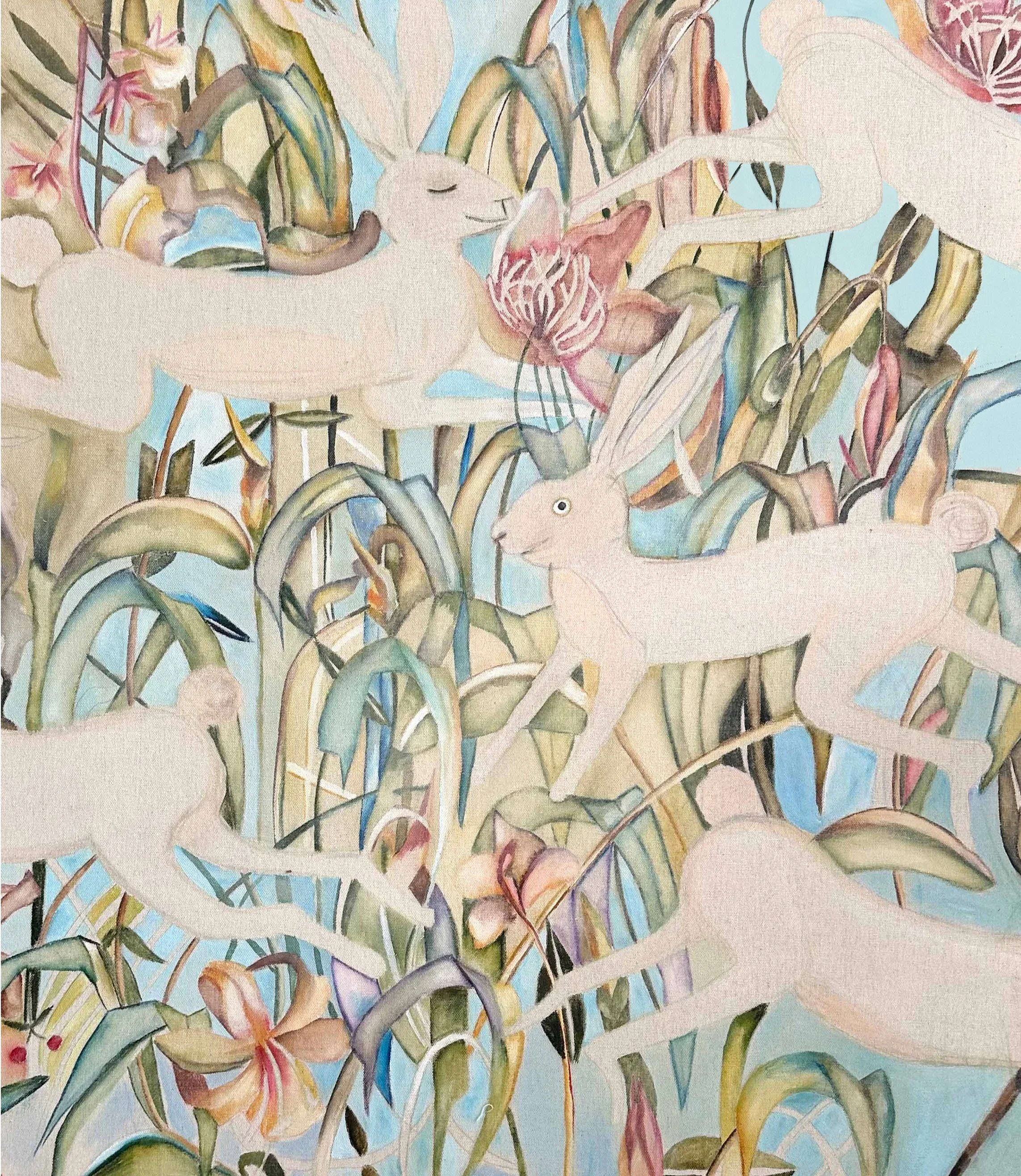 Playing in the Fields captures the lighthearted spirit of spring. Simplified silhouettes set against the natural canvas surface emphasize spontaneity and freshness, evoking the season’s playful energy.