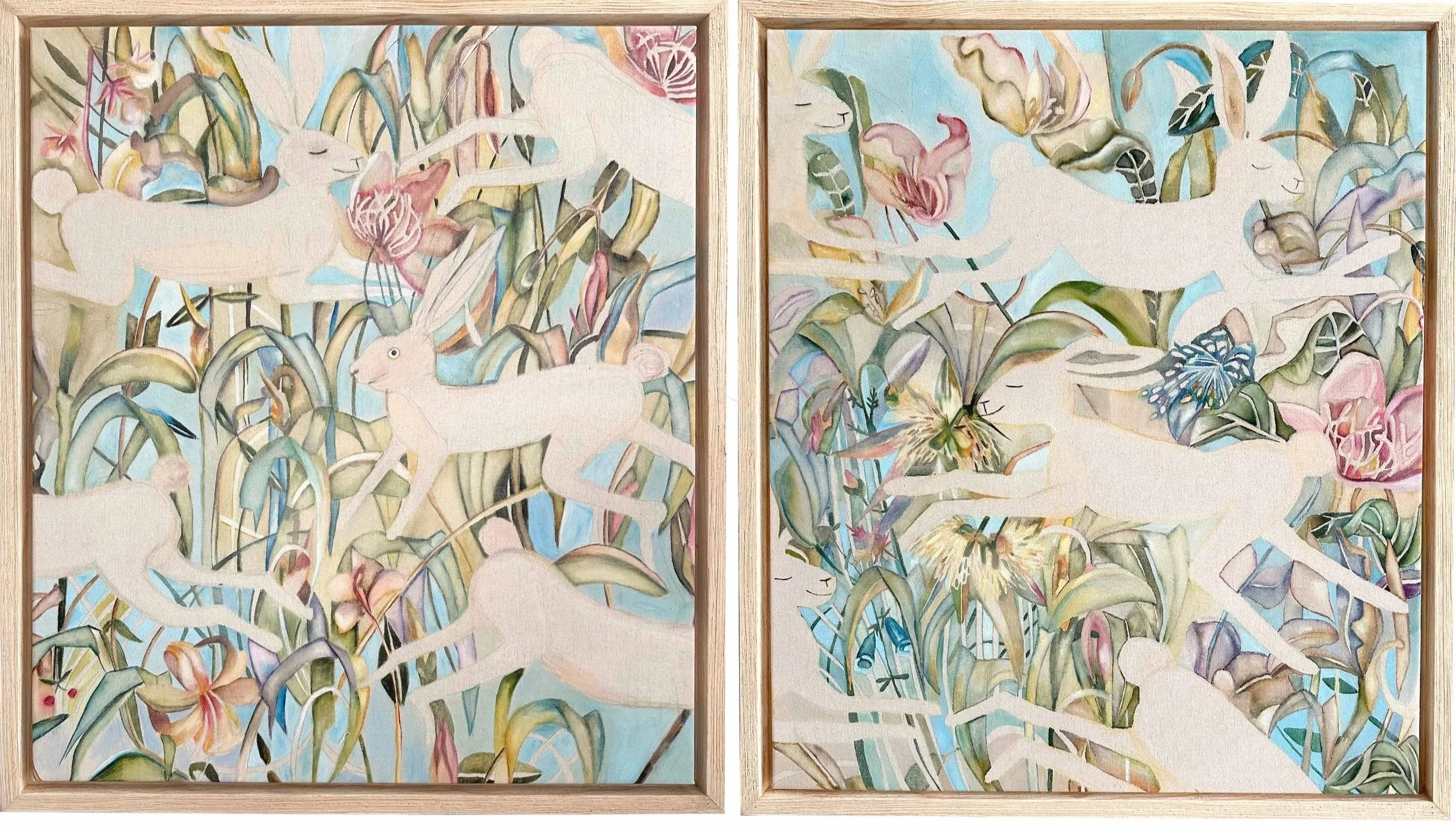 Playing in the Fields1 - 30 x 33 in each continuation of 2 paintings. Mixed media (acrylic inks and pigments) on raw natural canvas | Framed in raw wood floating frame. Price :2000USD